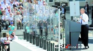 19日,柏林气温达30多摄氏度,奥巴马在柏林最具象征意义的勃兰登堡门前发表了演讲。他呼吁将全球战略核武器削减最高三分之一,并承诺采取更多行动应对气候变化挑战。