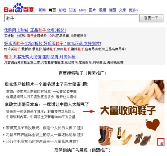 以上说的这种投放方式叫关键词定向,如果都没有人在鞋子这个行业做网盟,则百度会根据你的搜索关键词匹配如:“衣服、帽子”等其他相关的行业。如你在百度中搜索,然后再进入另一个网站,你会看到该网站上会出现鞋子或者衣服等相关的广告。